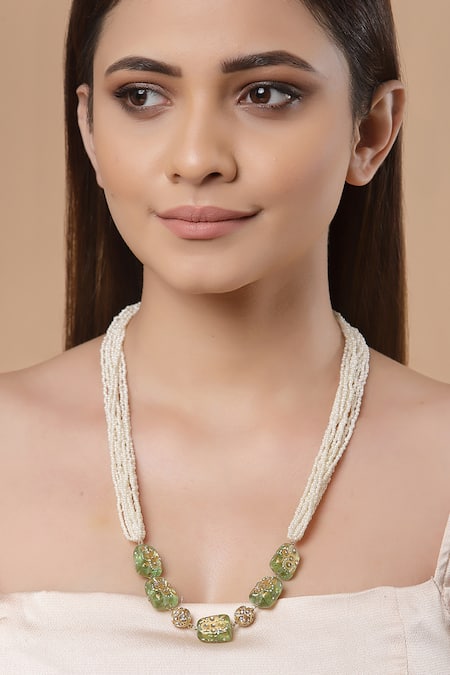 Gold plating with intricate pearl detailing, Natural stones with emerald embellishments, Layered design with a unique clasp closure