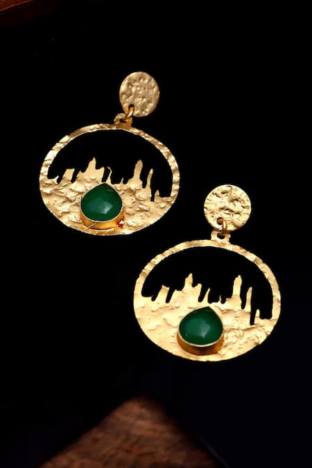Gold plated drop earrings featuring textured cut-out motifs embellished with green natural stones