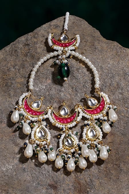 Gold plated design with intricate stone work, Natural stones and faux emerald detailing, Layered pearl embellishments for a luxurious look