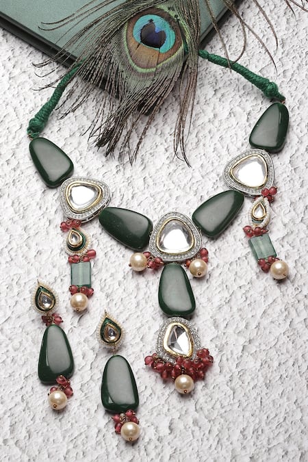 Gold plated necklace featuring kundan, American diamond, pearl, and natural stone embellishments. Paired with matching earrings for a complete look.