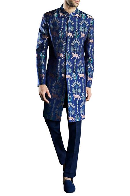 This navy blue sherwani features a vibrant tiger print for the man who likes to make a statement. Handwoven in Benarasi silk, this sherwani also features a Mandarin collar and a concealed placket.
