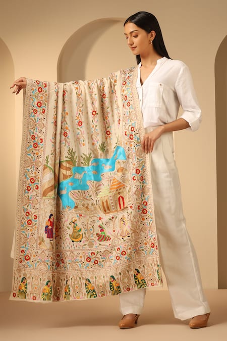 White Aanshi Rural Rajasthan Tila Kalamkari Pashmina Shawl