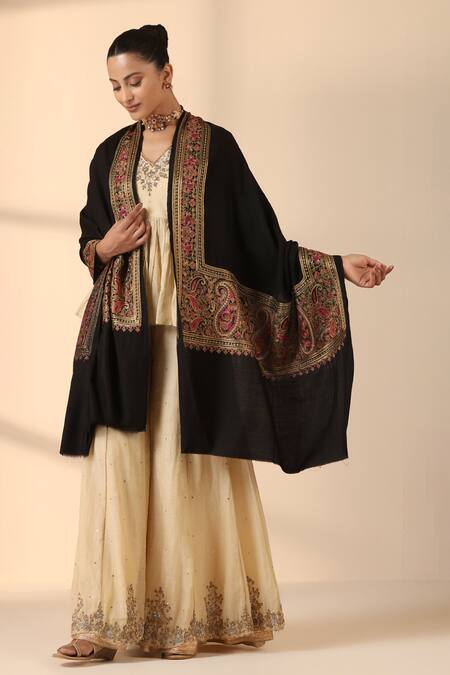 Black cashmere fine wool stole featuring aari work with floral paisley pattern on the border