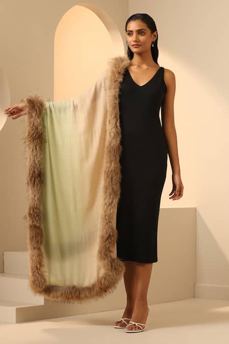 Peach and pista ombre stole crafted in cashmere fine wool with a premium natural fur border