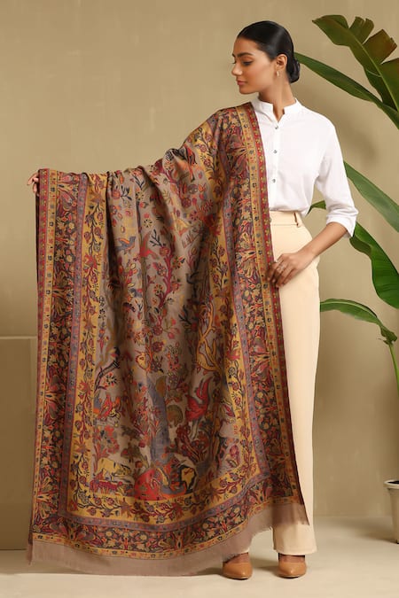 Brown shawl featuring floral woven motifs and a fringe tassel border