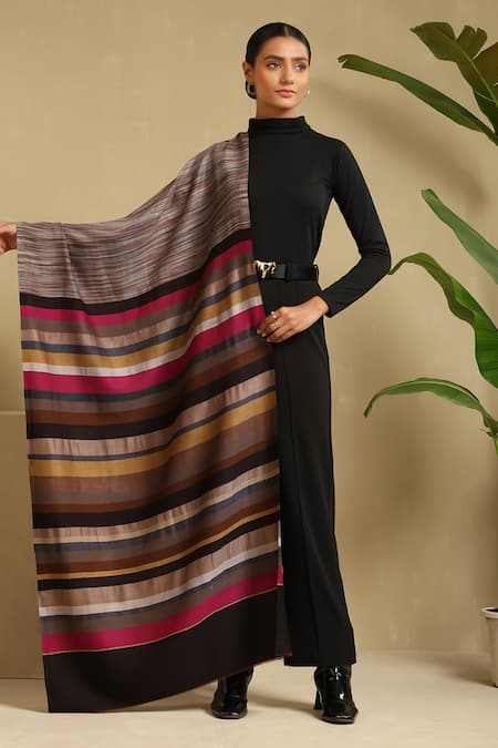 Multicolor reversible stole featuring stripe woven motifs and a fringe tassel border