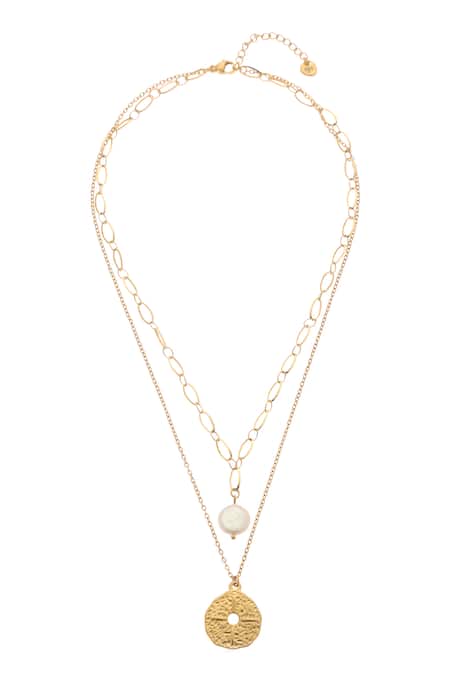Golden charm necklace featuring a freshwater pearl and a circular pendant.