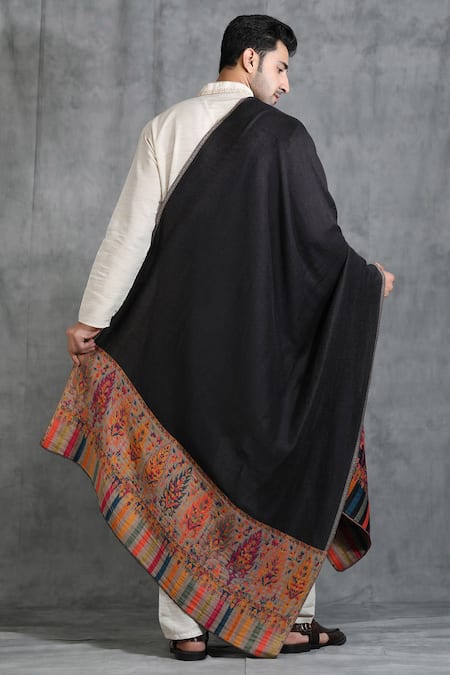Black handwoven cashmere fine wool reversible palla zari stole with multi colored patterns on border.