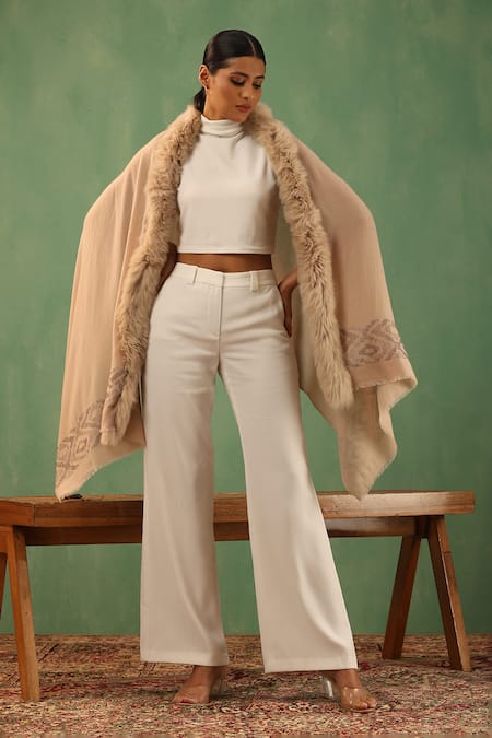 Stone studded embellishments, Fur detailing on collar, Patterned border design