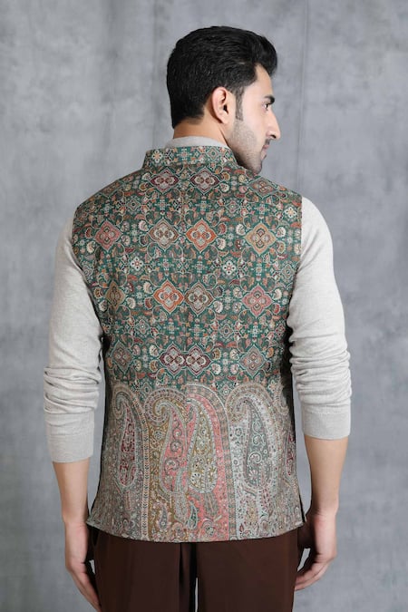 Green pashmina bundi with handwoven floral motifs and welt pockets in front.