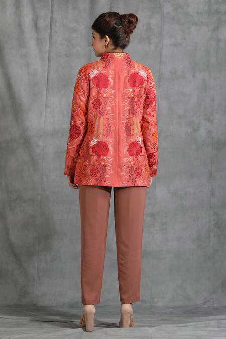 Orange Pashmina Thread Band Collar Rose Motif Jacket