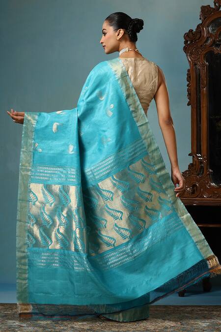 Sky blue handwoven saree crafted in kosa silk featuring duck motif with leaf pattern on the palla. It comes with a running blouse piece.