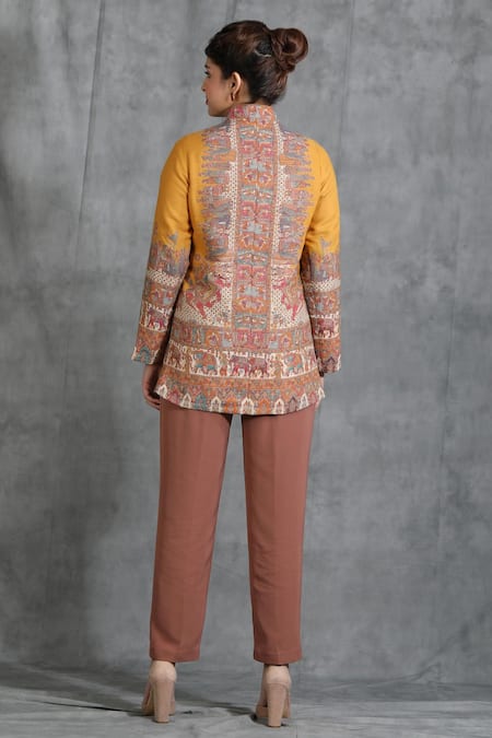 Mustard pashmina jacket with handwoven Royal palace and paisley motifs.
