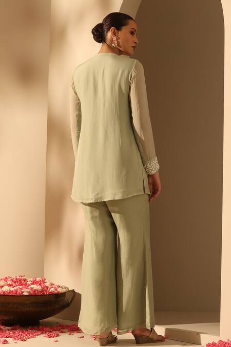 Green Organza Pearls, Embroidery Round Neck Saadgi Tunic With Pant