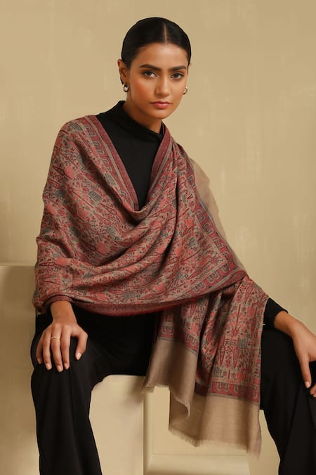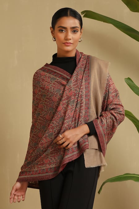 Beige stole featuring Kashmiri kani embroidery in a floral pattern with a fringe tassel border