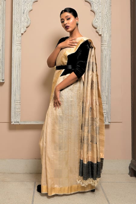 Beige tussar silk saree featuring an all-over gold and black zari handwoven checkered pattern. Accompanied by a running blouse piece measuring 1 meter in length.