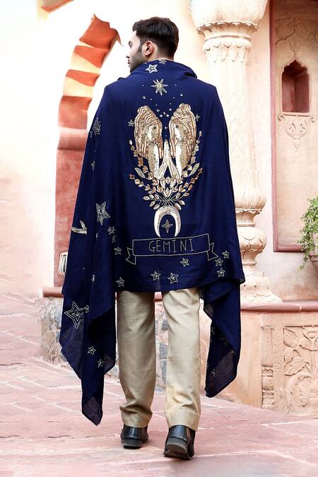 Blue shawl with Gemini theme with golden stars and the head of twins using sequins pipe and thread work.