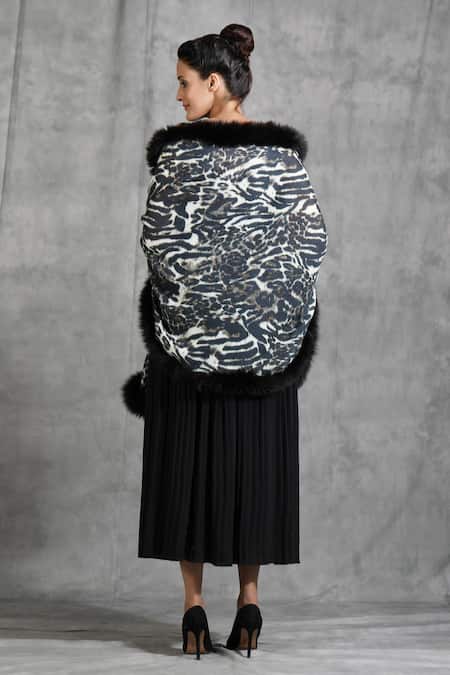 Black pashmina wool stole featuring an all-over digital animal print with a broad fur border