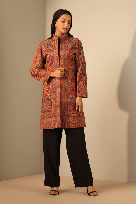 All-over woven floral and paisley patterns, Mandarin collar design, Full sleeves for added coverage