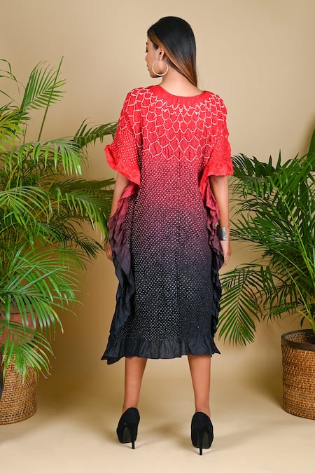 Red,black kaftan style midi dress with floral patterned Bandhani motifs & flared sleeves.