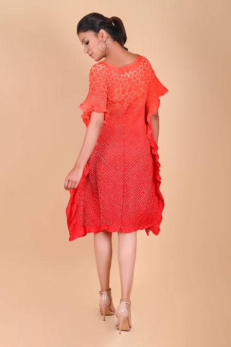 Red, orange kaftan style midi dress with floral patterned Bandhani motifs & flared sleeves.
