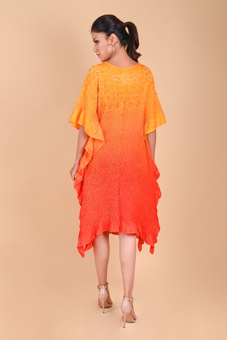 Yellow, orange kaftan style midi dress with floral patterned Bandhani motifs & flared sleeves.