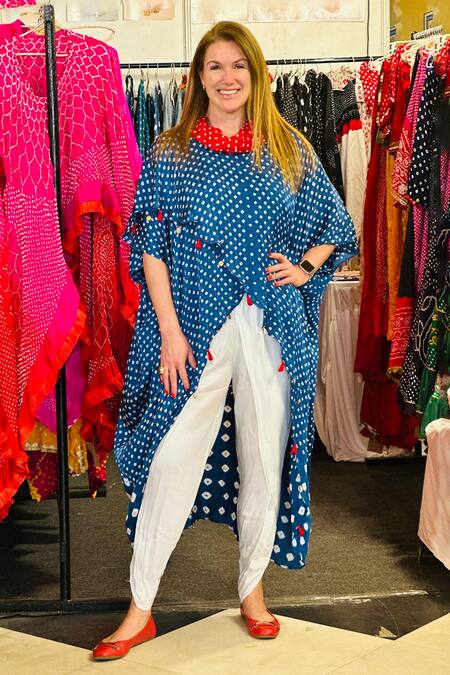 Blue Modal, Silk Tassels, Embroidery Bandhani Print Flared Sleeve Overlap Top