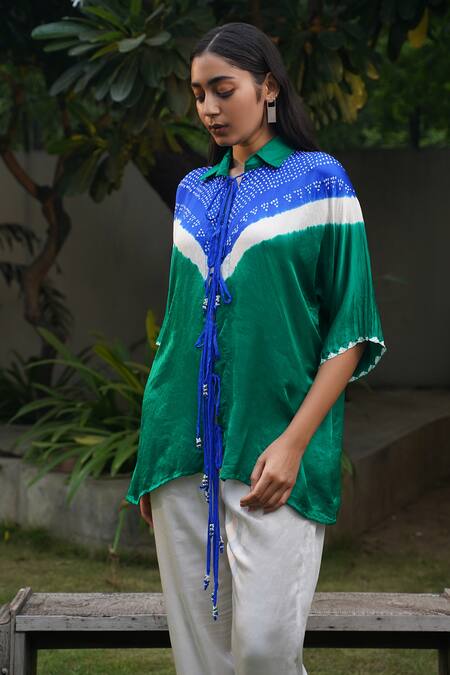 Green & blue front open shirt featuring a bandhani print and a tie-up string