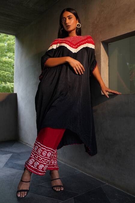 Black kaftan featuring red bandhani print with a round neckline and batwing sleeves. Paired with red bandhani printed pants.