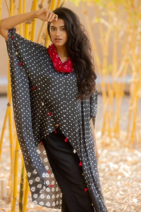 Black Modal, Silk Tassels Cowl Neck Bandhani Print Overlap Top