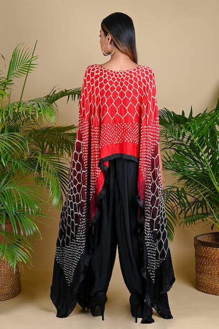 Ombre red, black asymmetric cape style tunic with Bandhani motifs & fringe border.