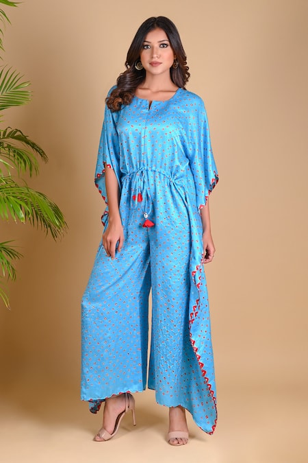 Sky blue kaftan style jumpsuit with Bandhani motifs, flared bottoms, tassel & sea shell front tie-up.
