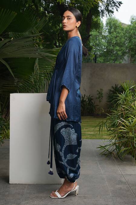 Indigo blue asymmetric top featuring a waist belt and tassel details. Paired with a rye bandhani print skirt.
