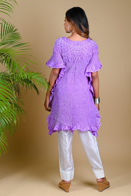 Purple Mulberry Silk Round Short Sleeved Bandhani Kurta