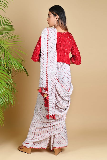 Off white pre-draped pant saree with Bandhani dyed motifs, tassel pallu & flared bottoms.