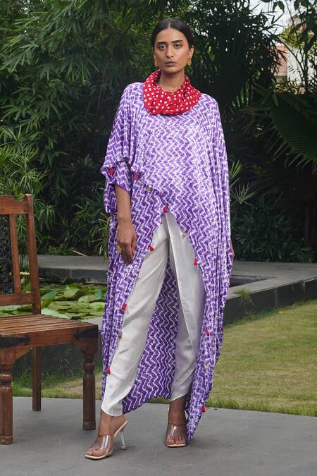 Purple zigzag shibori overlap kaftan top featuring bandhani print and handmade tassels