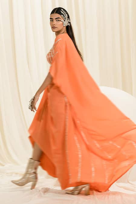 Orange satin organza bustier featuring gold sequins embroidered lines. Paired with a pure crepe cowl skirt and a long jacket with flared sleeves.