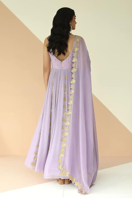 Lavender full kali anarkali with embroidery in resham, cutdana and nakshi work. Paired with embroidered cutwork dupatta hem.