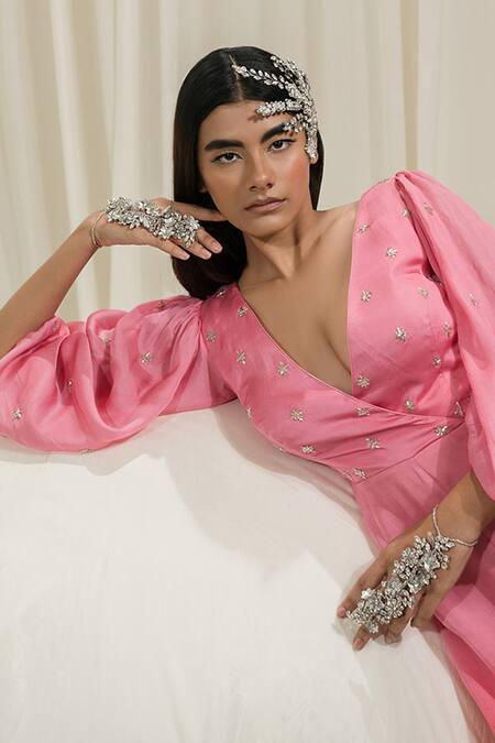 Pink satin organza jumpsuit featuring a V neckline and puffed sleeves