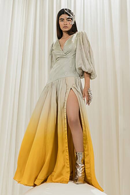 Silver butti embroidery on satin organza, Stylish slit detail for added flair, Puffed sleeves for a dramatic effect