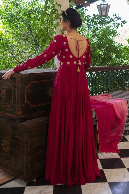 Magenta balloon sleeve anarkali featuring cutdana nakshi moti butti embroidery on the yoke. Accompanied by a viscose organza dupatta with embroidered small motifs.