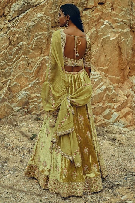 Yellow Velvet, Viscose Organza Nakshi Square Neck Embroidered Bridal Lehenga Set