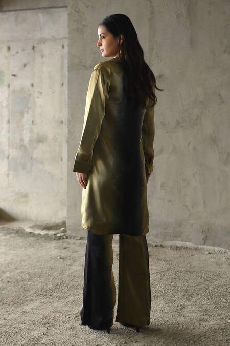 Gold liquid organza shirt dress featuring a collar neckline and full sleeves