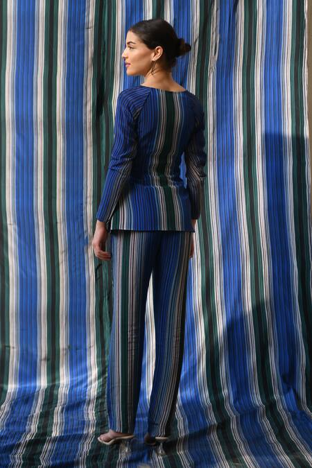 Blue Cupro Crepe Printed Stripe Sweetheart Neck Raglan Jacket