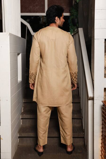 Brown angrakha kurta featuring a V neck and full sleeves with metallic embroidery on the cuffs. Paired with loose-fit pants for a coordinated look.