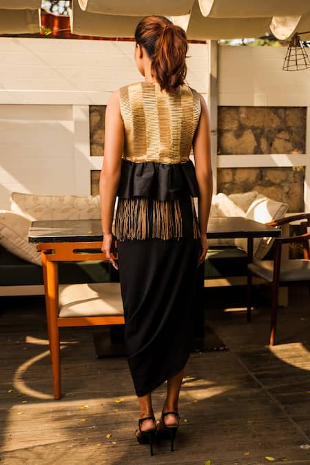 Gold peplum style bolero jacket top featuring a pleated bodice and black peplum trim at the waistline