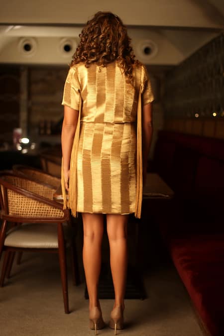 Gold short pleated dress featuring a cropped jacket style front and fringe detailing. Designed with a round neckline and half sleeves, made from tissue fabric.