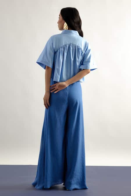Blue cropped shirt made from cotton satin featuring gathered detailing