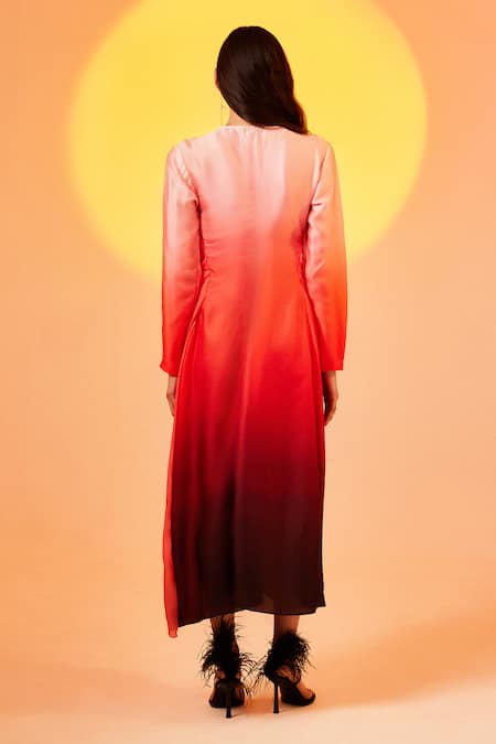Red and pink ombre A-line dress featuring a V neckline and full sleeves