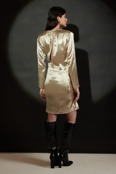 Buy_Echostudio_Gold Satin Round Neck Draped Dress _Online_at_Aza_Fashions